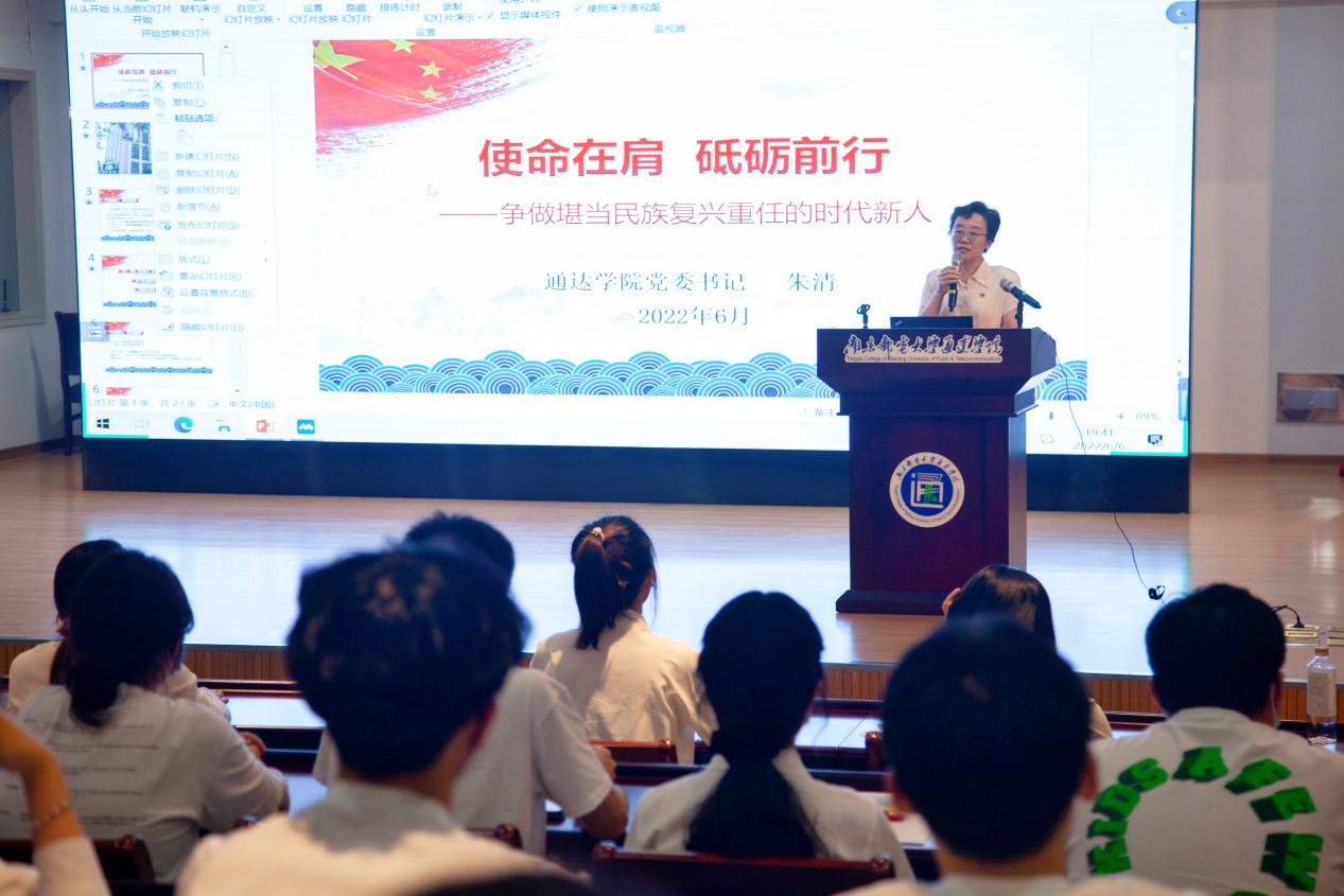 开班典礼结束后,朱清书记讲授“使命在肩,砥砺前行——争做堪当民族复兴重任的时代新人”专题党课。朱书记围绕中国共产党人的初心和使命,两个一百年奋斗目标,争做复兴栋梁、强国先锋等内容展开,重点讲授了作为一名SJB官网预备党员如何争做复兴栋梁。她强调要强化党员意识,要做到在平常时候看得出来,永葆为民初心,擦亮党徽红;要践行庄严承诺,要做到在关键时刻站得出来,牢记使命担当,勇当先锋队;要传承红色校史,挺起主心骨,牢记“一个党员就是一面旗帜”,时刻鞭策自己,身体力行,争当表率。